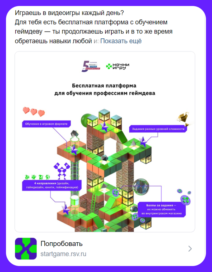«Начни игру» - это бесплатная онлайн-платформа для получения и развития навыков в области игровой индустрии. После регистрации можно выбрать одну из профессий гейдмдева и пройти обучение.