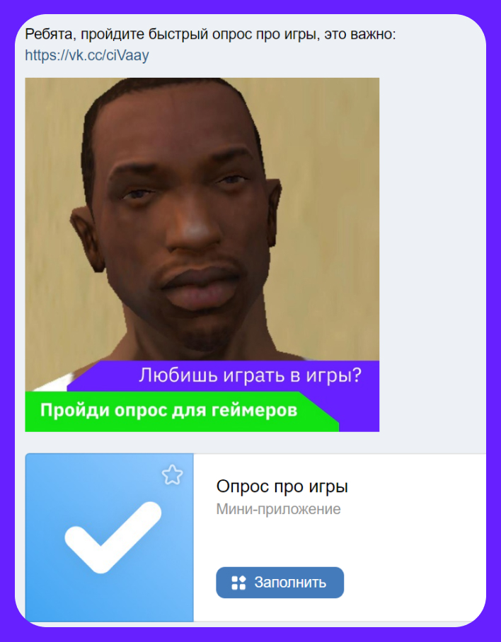 Запустили в социальной сети ВКонтакте опрос на тему игр и геймдева из 11 вопросов. Просили рассказать о своем отношении к играм и протестировать платформу. За два сезона опрос прошли >495 000 человек. Пользу компьютерных игр отметили 80+% опрошенных, 81% опрошенных думают, что навыки из компьютерных игр помогали/ помогают им в реальной жизни, 76,6% опрошенных пользователей уверены, что создавать игры это интересно. В результате проведения опроса, сформировали базу в рассылку сообщества из 380 000+ человек. По результатам опроса в первом сезоне провели конкурс на странице ВКонтакте проекта и создали стикеры для проекта с помощью нейросетей.